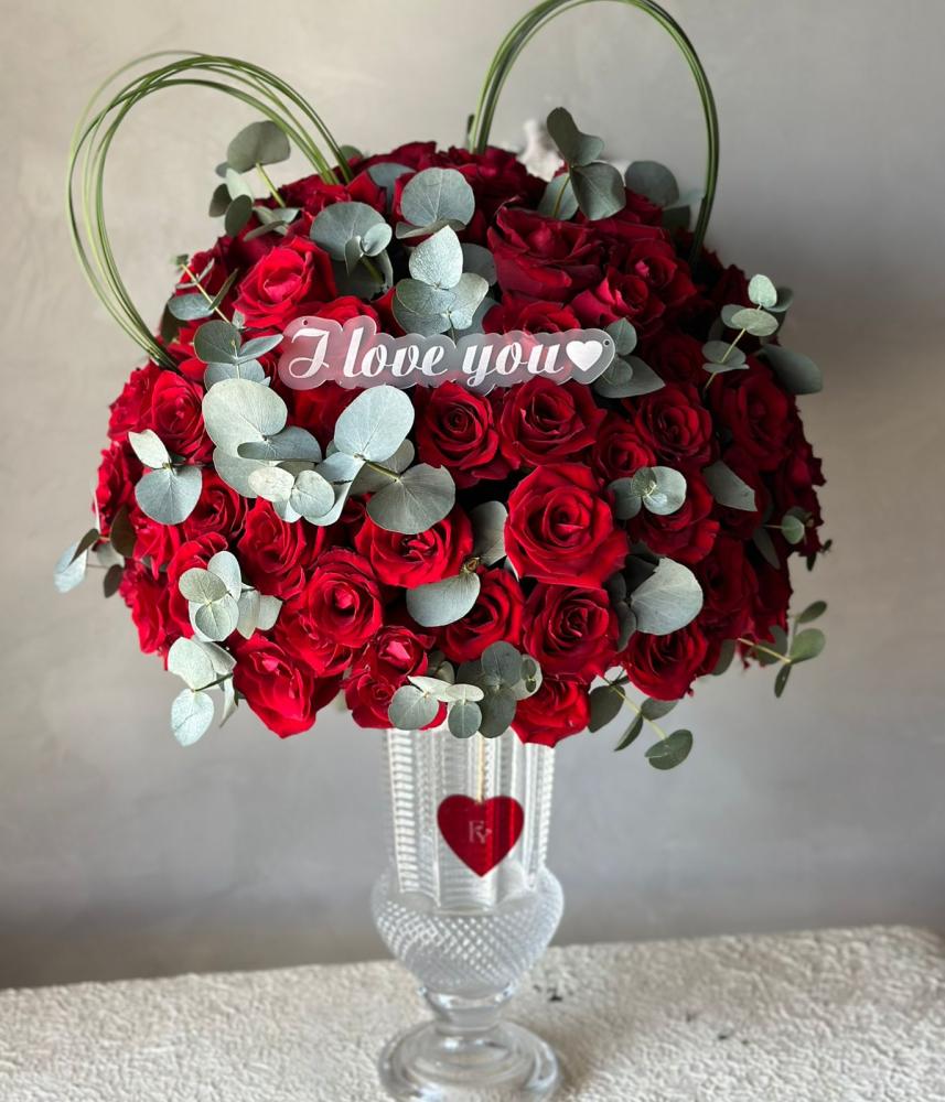 فازة زجاجيه تحتوي على مجموعة من ورود الجوري الطبيعيه