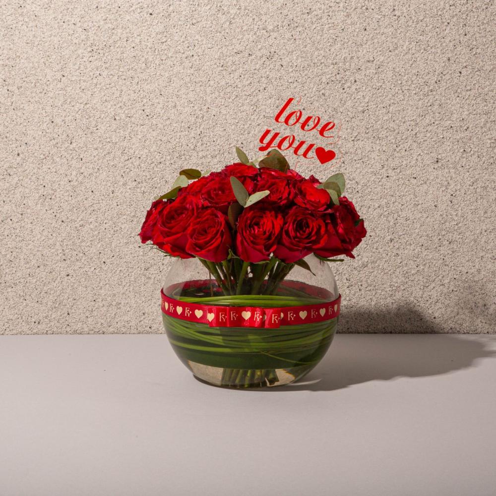 فازة زجاجيه تحتوي على مجموعة من ورود الجوري الطبيعيه