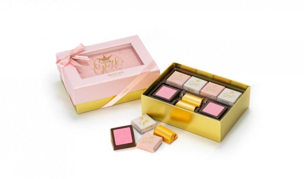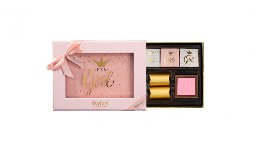 سلة أكريليك كبيرة الحجم تحتوي على علبة شوكليت مواليد فاخرة من شركة (بستاني) ومزينه بمجموعة من الورود الهولندية الطبيعية.
