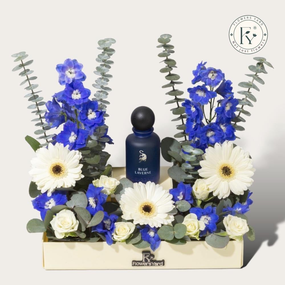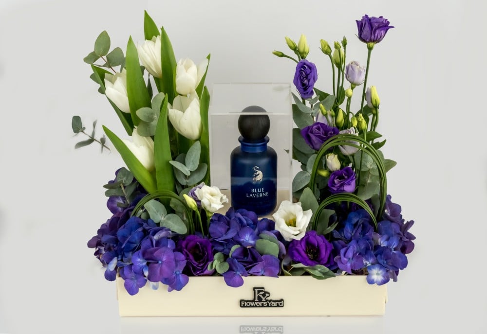 صينية اكريلك تحتوي على علبة ( عطر بلو لافيرن الرجالي ) ومجموعة من الورود الطبيعية الهولنديه والكينيه يتم تنسيقها وتجهيزها بشكل مميز ومختلف وبجودة عاليه .